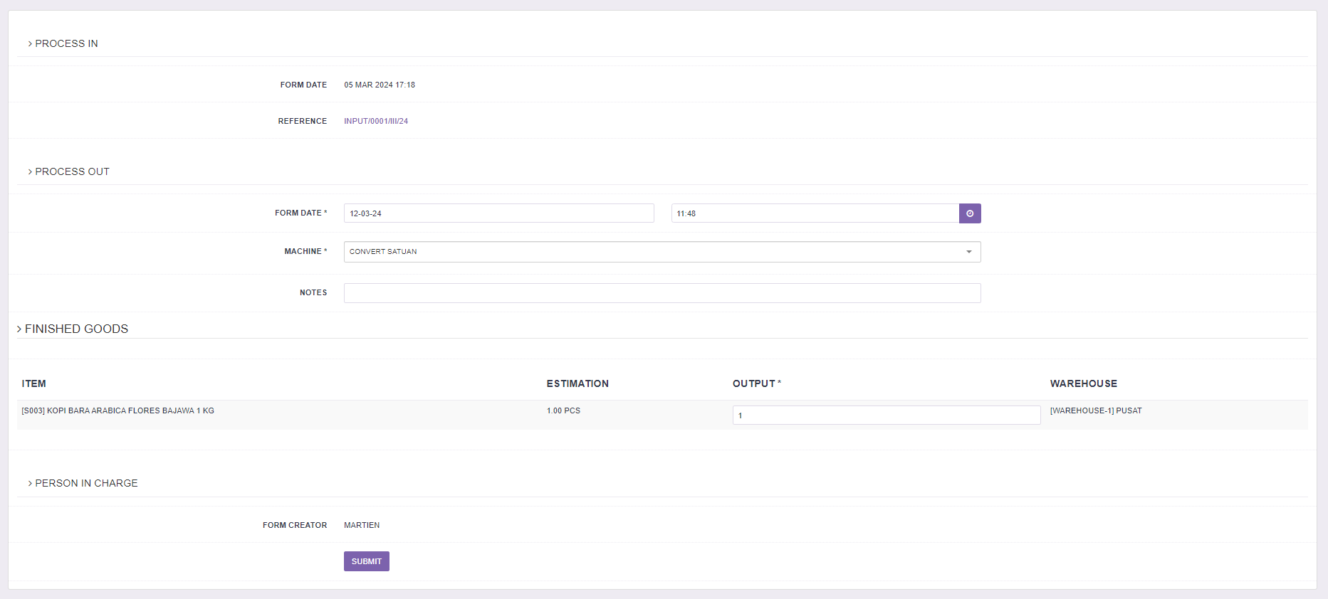 8. Klik submit untuk mengirimkan data process out&#x20;